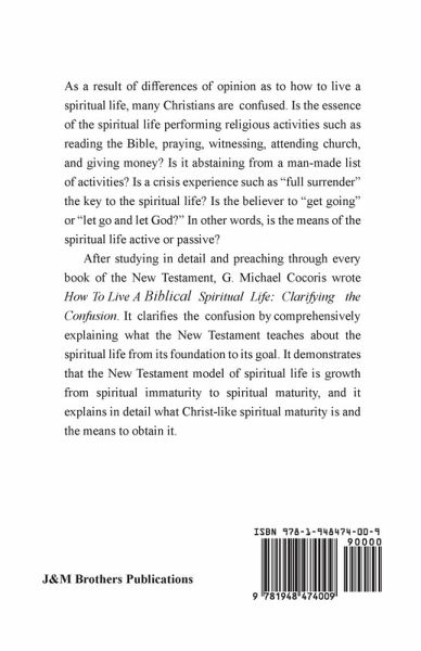 Is the essence of the spiritual life performing religious activities such as reading the Bible, praying, witnessing, attending church, and giving money? Is it abstaining from a man-made list of activities? As a result of differences of opinion as to how to live a spiritual life, many Christians are confused. Is the essence of the spiritual life performing religious activities such as reading the Bible, praying, witnessing, attending church, and giving money? Is it abstaining from a man-made list of activities? Is a crisis experience such as "full surrender" the key to the spiritual life? Is the believer to "get going" or "let go and let God?" In other words, is the means of the spiritual life active or passive? After studying in detail and preaching through every book of the New Testament, G. Michael Cocoris wrote The Spiritual Life: Clarifying the Confusion. It clarifies the confusion by comprehensively explaining what the New Testament teaches about the spiritual life from its foundation to its goal. It demonstrates that the New Testament model of spiritual life is growth from spiritual immaturity to spiritual maturity, and it explains in detail what Christ-like spiritual maturity is and the means to obtain it.