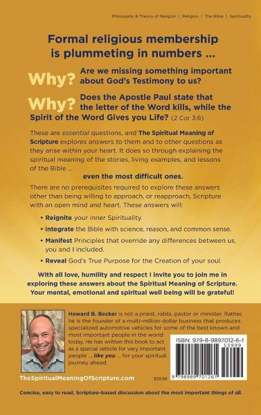Hardback with black text and illustrations Bestseller ... #1 Spiritual Growth #1 Personal Growth #1 Women's Spirituality #1 Personal Growth & Christianity #1 Christian Living #1 Spirituality #1 Women's Christian Living ¿Why is formal religious membership plummeting in numbers? Why are we missing something important about God's Testimony to us? Why does the Apostle Paul state that the letter of the Word kills, while the Spirit of the Word Gives you Life? (2 Cor 3:6) These are essential questions, and The Spiritual Meaning of Scripture explores answers to them and to other questions as they arise within your heart. It does so through explaining the spiritual meaning of the stories, living examples, and lessons of the Bible ... even the most difficult ones. This is a time when so many people need good, sensible and sustainable information about what matters most in life. The Spiritual Meaning of Scripture brings those answers to the forefront so that they may act to reunite the many divisions that have come to permeate today's modern society, both religious and secular. The content of this book will provoke much discussion, having the potential to ignite religious, spiritual, mental health and scientific reasoning about the Purpose of human existence. When read, you will find it welcoming and embracing for many years to come. There are no prerequisites needed to explore these answers other than being willing to approach, or reapproach, Scripture with an open mind and heart. These answers will: ¿ Reignite your inner Spirituality. ¿ Integrate the Bible with science, reason, and common sense. ¿ Manifest Principles that override any differences between us, you and I included. ¿ Reveal God's True Purpose for the Creation of your soul. With all love, humility, respect and gratitude, author Howard B. Becker invites you to join him in exploring these answers about the Spiritual Meaning of Scripture. He delivers it in a concise, easy-to-read, Scripture-based discussion about the most important things of all.Your mental, emotional, and spiritual wellbeing will be grateful!