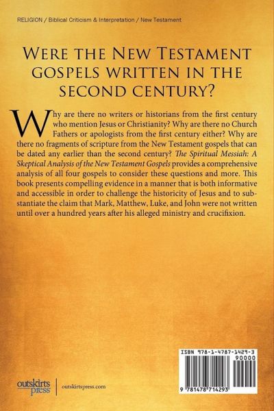 Why are there no writers or historians from the first century who mention Jesus or Christianity? Why are there no Church Fathers or apologists from the first century either? Why are there no fragments of scripture from the New Testament gospels that can be dated any earlier than the second century? The Spiritual Messiah: A Skeptical Analysis of the New Testament Gospels provides a comprehensive analysis of all four gospels to consider these questions and more. This book presents compelling evidence in a manner that is both informative and accessible in order to challenge the historicity of Jesus and to substantiate the claim that Mark, Matthew, Luke, and John were not written until over a hundred years after his alleged ministry and crucifixion.