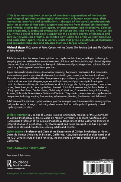 Topics discussed include dreams, dissociation, creativity, therapeutic relationship, free association, transcendence, poetry, paradox, doubleness, loss, death, grief, mystery, embodiment and soul. The authors, clinicians with decades of experience in psychotherapy, psychoanalysis and spiritual practice, draw from their deep engagement with spirituality and psychoanalysis, focusing on a particular theme and its application to clinical work that is supported by the generative conversation among these lineages. At once applied and theoretical, this book weaves insights from the heart of Vajrayana Buddhism, Zen Buddhism, Christianity, Catholicism, Ecumenicism, Integral Spirituality, Judaism, Kabbalah, Non-violence, Sufism and Vedanta. They are in conversation with psychoanalytic perspectives including Jungian, Post-Jungian, Winnicottian, Bionian, Post-Bionian and Relational.