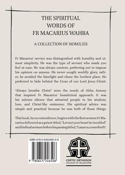 Fr Macarius' service was distinguished with humility and utmost simplicity. He was the type of servant who made you feel at ease. He was always content, preferring not to impose his opinion on anyone. He never sought worldly glory, rather, he avoided the limelight and always chose the lowliest place. He preferred to hide behind the Cross of our Lord Jesus Christ. "Always breathe Christ" were the words of Abba Antony that inspired Fr Macarius' homiletical approach. It was his solemn silence that attracted people to his wisdom, love, and Christ-like eminence. His spiritual advice was simple and practical because he was both of those things. This book, by no coincidence, begins with the first sermon Fr Macarius delivered as a priest titled "Let not your heart be troubled" and his final sermon before his passing titled, "Lazarus, come forth".