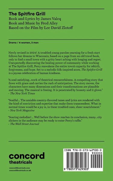 Music and Book by James Valcq, Lyrics and Book by Fred Alley Based on the film by Lee David Zlotoff Musical Drama Characters: 3 male, 4 female Unit Set A feisty parolee follows her dreams, based on a page from an old travel book, to a small town in Wisconsin and finds a place for herself working at Hannah's Spitfire Grill. It is for sale but there are no takers for the only eatery in the depressed town, so newcomer Percy suggests to Hannah that she raffle it of