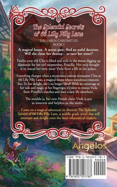 A magical house. A secret past. And an awful decision. Will she claim her destiny... or save her sister? Twelve-year-old Chia is blind and toils in the mines digging up diamonds for her evil stepmother, Priscilla. Her only thought is to rescue her twin sister Viola from a life at the palace. Everything changes when a mysterious woman transports Chia to 66 Lilly Pilly Lane, a magical house where wondrous creatures live. To her delight, she's no longer blind! With an entourage at her side and magic at her fingertips, it's time to rescue Viola from Priscilla's clutches and start a new life elsewhere. The trouble is, her new friends claim Viola is not as innocent and helpless as she seems... Come on a magical adventure to discover The Splendid Secrets of 66 Lilly Pilly Lane, a middle-grade novel that will entertain and delight even the most reluctant of readers. Ideal for kids ages 9+ and adults who love adventurous, page-turning fantasy stories.