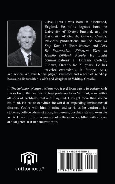 In The Splendor of Starry Nights you travel from agony to ecstasy with Lester Field, the neurotic college professor from Vermont, who battles all sorts of problems, real and imagined. He's got more than sex on his mind. He has to convince the world of impending environmental disaster. You're with him in mind and spirit as he confronts his students, college administration, his parents, psychiatrists and even the White House. He's on a journey of self-discovery, filled with despair and laughter. Just like the rest of us.