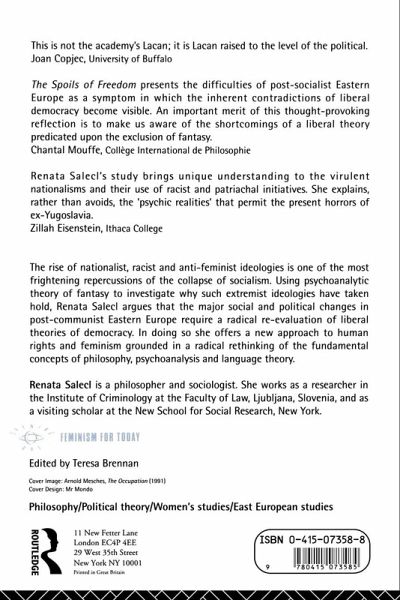 The rise of nationalist, racist and anti-feminist ideologies is one of the most frightening repercussions of the collapse of socialism. Using psychoanalytic theories of fantasy to investigate why such extremist ideologies have taken hold, Renata Salecl argues that the major social and political changes in post-communist Eastern Europe require a radical re-evaluation of notions of liberal theories of democracy. In doing so she offers a new approach to human rights and feminism grounded in her own active partipation in the struggles, first against communism and now against nationalism and anti-feminism.