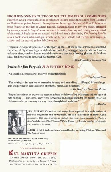 More than just a "man and his dog" hunting adventure, The Sporting Road is a book about the land and man's place in it. It is also, in many ways, a book about relationships; with nature, animals, and the people with who live around us. As Rick Bass says in his introduction, Jim Fergus is a man for whom "The common denominator is not geographical, but internal; here is a man who belongs intensely to the living. And slowly, gradually --essay by essay--you become aware of the unsaid: the fact that he fits a diminishing time, a diminishing space, and a diminishing code of manners. That he always puts others before him; that he considers and respects his friends, his prey, his dogs, and the landscapes that engage these things."