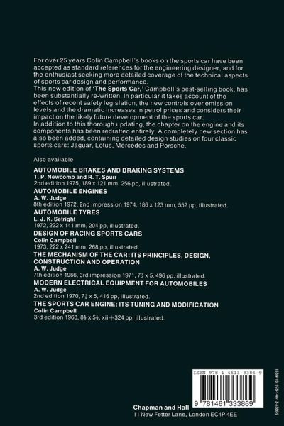 1 The Development of the Sports Car.- Motor sport.- The sports car.- The history of the sports car.- The first sports car.- The fabulous years.- Historic sports cars.- The future of the sports car.- 2 The Engine: Combustion.- Cylinder head history.- Combustion chamber research.- Volumetric efficiency.- Knock.- Limiting compression ratio.- Types of combustion chamber.- 3 The Engine: Induction and Exhaust.- The induction system.- The 4-cylinder in-line engine.- The 6-cylinder in-line engine.- The V-8 engine.- Ramming induction pipes.- Ramming pipe theory.- Forward-ram intakes.- Cold-air intakes.- The exhaust system.- The silencer.- Ramming exhaust pipes.- Branched exhaust pipes.- 4 The Engine: Valve Gear.- Push-rod valve operation.- Double overhead valve operation.- Single overhead camshaft head.- The four-valve head.- Desmodromic operation.- 5 The Engine: Fuel Metering.- The carburettor.- The S.U. principle.- The H.I.F. model.- Fuel injection.- Lucas electronic fuel injection.- Bosch K-Jetronic mechanical system.- 6 The Engine: Miscellaneous Components.- The crankcase.- The crankshaft.- Crankshaft bearings: bearing pressures: bearing materials.- General lubrication.- Pistons.- Cooling: air cooling: water cooling.- The ignition system: sparking plugs: the conventional coil ignition: new ignition developments.- 7 Road-Holding.- Tyres: the grip on the road: the tyre footprint.- Cornering power.- Tyre construction.- Aquaplaning.- Cornering behaviour: oversteer and understeer: rear wheel drive: front wheel drive: braking.- The mid-engined sports car.- Factors leading to understeer.- 8 The Suspension.- Springs.- Pitching.- Independent suspension.- Shimmy and tramp.- Representative designs: Jaguar, Porsche, Datsun, Aston Martin.- The suspension damper: double-tube damper: single tube damper.- 9 The Chassis, Frame and Body.- Materials.- Torsional stiffness.- The tubular frame.- Unitary body-chassis construction.- The backbone chassis.- The shape of the body: drag coefficients, lift at high speed, the air dam, directional stability at high speed.- 10 The Transmission.- Torque multiplication.- The gear ratios.- The overdrive.- Synchromesh.- The automatic transmission.- The clutch.- The final drive.- Universal joints.- The limited slip differential.- 11 The Brakes.- The grip on the road.- Braking forces.- Weight transference under braking.- Brake fade.- Disc brakes: disc brakes for the high-speed sports car, pad materials.- 12 Performance.- Standards of performance.- The meaning of power.- Acceleration: acceleration times for 0-60 m.p.h., the concept of effective mass.- Maximum speed.- 13 The Sports Car in the Future.- The Engine: promising alternatives, the gas turbine, rotating combustion engines, the Diesel engine, the Stirling engine, the steam engine.- Petrol engine developments: stratified charge: turbocharging: air fuel ratio control.- The transmission.- Tyres and suspension: no-roll suspension.- Braking.- The long-life car.- 14 Design Studies.- The Jaguar.- The Lotus.- The Mercedes.- The Porsche.