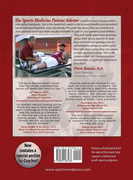 The Sports Medicine Patient Advisor contains easy to copy patient education handouts. This is the book that needs to be on every health care provider's bookshelf and should be used constantly. Pre-print the topics that are common to your practice and have them readily available to give to your patients and athletes. Review the handouts with your patients and be sure they understand how to do the rehab. Your patients will really appreciate learning about their sports injuries or problems and will love getting a home rehabilitation program with a plan that tells them when they can return to…mehr