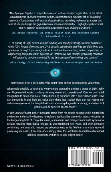 You've never been a porn actor. Why might there still be porn featuring you online? What could possibly go wrong as we give more computing devices a sense of sight? Why are Al-generated works suddenly winning visual art competitions? Can we use facial recognition to catch criminals-without penning ourselves into a surveillance state? How can nematode brains help us make algorithms less racist? How can we reduce our radiation exposure at the hospital without sacrificing diagnostic accuracy, and when do I get my own Al-powered soccer coach? In The Spring of Sight, Robert Boscacci draws from his double background in digital film production and machine learning to explore questions like these with industry experts. In the burgeoning field of computer vision, researchers and entrepreneurs build systems to extract meaning from digital images in unprecedented new ways, and even generate convincing new synthetic images. As advancements in the field carry in a tidal wave of promising use cases, it becomes increasingly clear that we'll have to implement nuanced policies to contend with their double-edged nature.