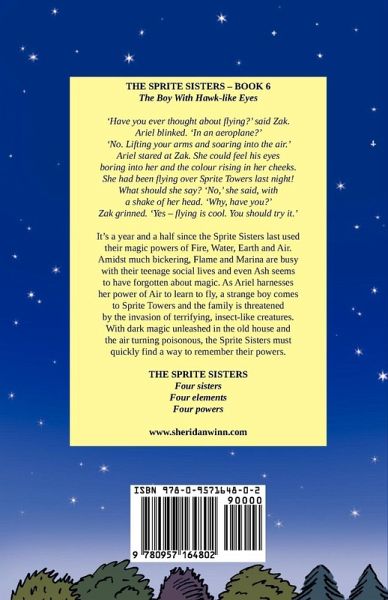 THE SPRITE SISTERS Four sisters Four elements Four powers 'The Boy With Hawk-like Eyes' is the sixth in Sheridan Winn's bestselling Sprite Sister series. Aimed at 'tween' readers, these fantasy adventure stories have been bestsellers for Fischer Verlag, with over 550,000 hardback copies sold in Germany and is soon to be produced as a film - released in 2019. Piccadilly Press published the first five titles in the UK, where the books have a keen fan base. 'Have you ever thought about flying?' said Zak. Ariel blinked. 'In an aeroplane?' 'No. Lifting your arms and soaring into the air.' Ariel stared at Zak. She could feel his eyes boring into her and the colour rising in her cheeks. She had been flying over Sprite Towers last night! What should she say? 'No,' she said, with a shake of her head. 'Why, have you?' Zak grinned. 'Yes - flying is cool. You should try it.' It's a year and a half since the Sprite Sisters used their magic powers of Fire, Water, Earth and Air. Amidst much bickering, Flame and Marina are busy with their teenage social lives and even Ash seems to have forgotten about magic. As Ariel harnesses her power of Air to learn to fly, a strange boy comes to Sprite Towers and the family is threatened by the invasion of terrifying, insect-like creatures. With dark magic unleashed in the old house and the air turning poisonous, the Sprite Sisters must quickly find a way to remember their powers.