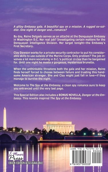 A glitzy Embassy gala. A beautiful spy on a mission. A rugged ex-soldier. One night of danger and...romance? By day, Reine Delgado serves as an attaché at the Denquayan Embassy in Washington D.C. Her real job? Investigating certain matters for the Denquayan Intelligence Division. Her target tonight-the Embassy's First Secretary. Clay Dawson works for a private security contractor to put his considerable skills to use outside of the Marine Corps. Only problem? The job involves a lot more socializing in D.C.'s political circles than he bargained for. Until one night he meets a gorgeous, mysterious brunette. When the unthinkable threatens both the gala and her mission, Reine finds herself forced to choose between failure and trusting this handsome American stranger. She and Clay might just fall in love-if they manage to survive the night. Welcome to The Spy at the Embassy Special Edition, a clean spy romance sure to keep you entranced until the very last page. BONUS! This Special Edition ebook also contains the novella Danger at the Embassy, which was the inspiration for this expanded novel.
