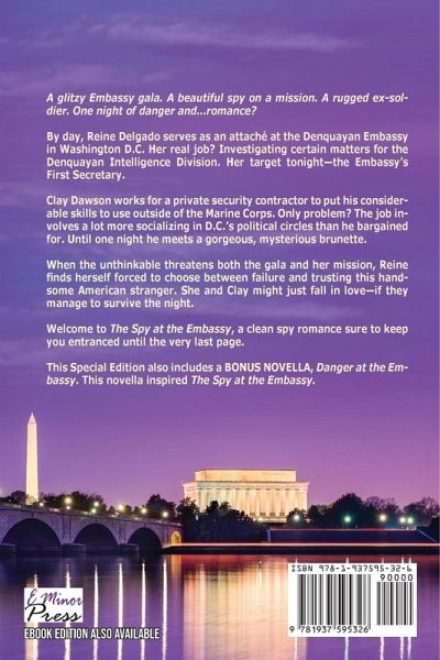 A glitzy Embassy gala. A beautiful spy on a mission. A rugged ex-soldier. One night of danger and...romance? By day, Reine Delgado serves as an attaché at the Denquayan Embassy in Washington D.C. Her real job? Investigating certain matters for the Denquayan Intelligence Division. Her target tonight-the Embassy's First Secretary. Clay Dawson works for a private security contractor to put his considerable skills to use outside of the Marine Corps. Only problem? The job involves a lot more socializing in D.C.'s political circles than he bargained for. Until one night he meets a gorgeous, mysterious brunette. When the unthinkable threatens both the gala and her mission, Reine finds herself forced to choose between failure and trusting this handsome American stranger. She and Clay might just fall in love-if they manage to survive the night. Welcome to The Spy at the Embassy Special Edition, a clean spy romance sure to keep you entranced until the very last page. BONUS! This Special Edition ebook also contains the novella Danger at the Embassy, which was the inspiration for this expanded novel.