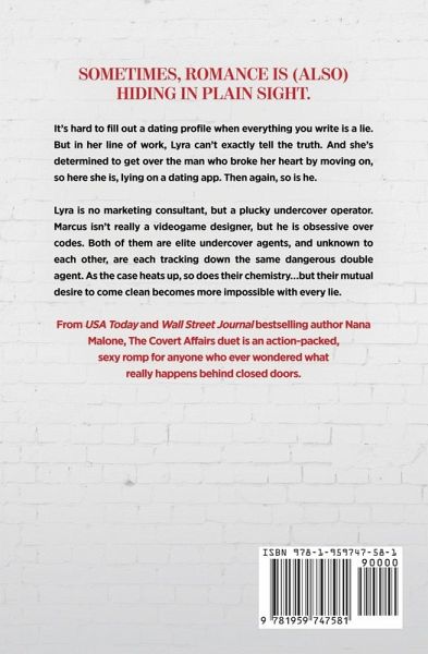 Sometimes, romance is (also) hiding in plain sight. It's hard to fill out a dating profile when everything you write is a lie. But in her line of work, Lyra can't exactly tell the truth. And she's determined to get over the man who broke her heart by moving on, so here she is, lying on a dating app. Then again, so is he. Lyra is no marketing consultant, but a plucky undercover operator. Marcus isn't really a videogame designer, but he is obsessive over codes. Both of them are elite undercover agents, and unknown to each other, are each tracking down the same dangerous double agent. As the case heats up, so does their chemistry...but their mutual desire to come clean becomes more impossible with every lie. From USA Today and Wall Street Journal bestselling author Nana Malone, The Covert Affairs duet is an action-packed, sexy romp for anyone who ever wondered what really happens behind closed doors.