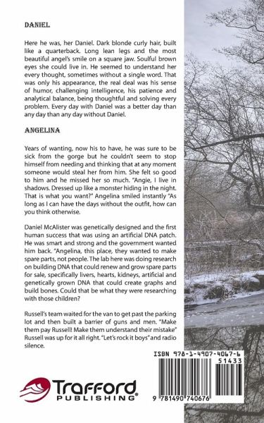 Daniel Here he was, her Daniel. Dark blonde curly hair, built like a quarterback. Long lean legs and the most beautiful angel's smile on a square jaw. Soulful brown eyes she could live in. He seemed to understand her every thought, sometimes without a single word. That was only his appearance, the real deal was his sense of humor, challenging intelligence, his patience and analytical balance, being thoughtful and solving every problem. Every day with Daniel was a better day than any day than any day without Daniel. angelina Years of wanting, now his to have, he was sure to be sick from the gorge but he couldn't seem to stop himself from needing and thinking that at any moment someone would steal her from him. She felt so good to him and he missed her so much. "Angie, I live in shadows. Dressed up like a monster hiding in the night. That is what you want?" Angelina smiled instantly "As long as I can have the days without the outfit, how can you think otherwise. Daniel McAlister was genetically designed and the first human success that was using an artificial DNA patch. He was smart and strong and the government wanted him back. "Angelina, this place, they wanted to make spare parts, not people. The lab here was doing research on building DNA that could renew and grow spare parts for sale, specifically livers, hearts, kidneys, artificial and genetically grown DNA that could create graphs and build bones. Could that be what they were researching with those children? Russell's team waited for the van to get past the parking lot and then built a barrier of guns and men. "Make them pay Russell! Make them understand their mistake" Russell was up for it all right. "Let's rock it boys" and radio silence.