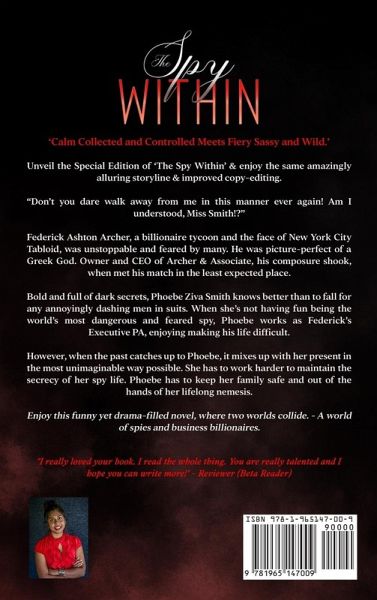 "This new edition is amazing and was a good vacation read. It was not too fast-paced, and not boring, making me want to continue reading to know what happens next." - Beta Reader. "The characters are really amazing. I mean, they portray real emotions and at the same time don't." - Wattpad Reviewer. Her primary goal is to protect her family and her secrets. But what happens when the truth about her family is uncovered by the guy she is forbidden to kill? Born in a world of secrecy, assassins, and danger, Phoebe Smith, a ferocious and unforgiving spy, is an expert at leading several lives. Always in control and driven by hatred and a need for vengeance, Phoebe is a loving mother who would go to any length to protect her kids. Even if it means securing a cover as Federick Archer's executive personal assistant - someone she couldn't hurt even if she wanted. However, as fire meets cold and Federick's curious interrogation leads him to discover Phoebe's kids and their relationship with his family, Phoebe's well-established cover quakes. Simultaneously, her past catches up to her in the most unimaginable ways, threatening to destroy all she had built. Will Phoebe be able to prevent both her worlds from colliding? Or will her past and present turmoil crash into each other and drown her? A novel packed with romance, drama, and hilarious moments in a world of spies and business billionaires. Unveil the Special Edition of 'The Spy Within' & enjoy the same amazingly alluring storyline & improved copy-editing.
