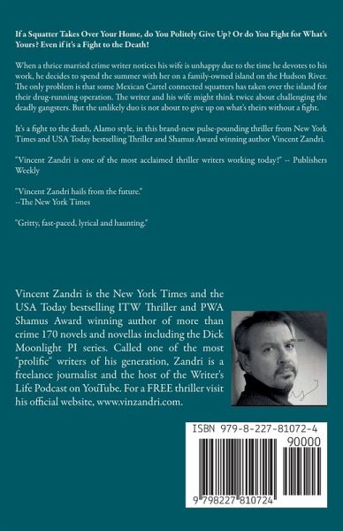 If a Squatter Takes Over Your Home, do You Politely Give Up? Or do You Fight for What's Yours? Even if it's a Fight to the Death! When a thrice married crime writer notices his wife is unhappy due to the time he devotes to his work, he decides to spend the summer with her on a family-owned island on the Hudson River. The only problem is that some Mexican Cartel connected squatters has taken over the island for their drug-running operation. The writer and his wife might think twice about challenging the deadly gangsters. But the unlikely duo is not about to give up on what's theirs without a fight. It's a fight to the death, Alamo style, in this brand-new pulse-pounding thriller from New York Times and USA Today bestselling Thriller and Shamus Award winning author Vincent Zandri. "Vincent Zandri is one of the most acclaimed thriller writers working today!" -- Publishers Weekly "The story of Vincent Zandri is the story of our times." --Business Insider "Vincent Zandri hails from the future." --The New York Times "Sensational . . . masterful . . . brilliant." --New York Post "Gritty, fast-paced, lyrical and haunting." --Harlan Coben, New York Times bestselling author of Six Years "Tough, stylish, heartbreaking." --Don Winslow, New York Times bestselling author of Savages and Cartel. "...big time author..." --Digital Journal