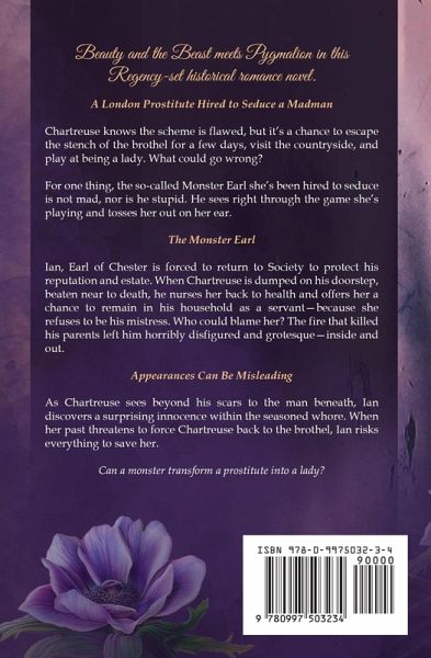 Beauty and the Beast meets Pygmalion in this Regency-set historical romance novel. A London Prostitute Hired to Seduce a Madman Chartreuse knows the scheme is flawed, but it's a chance to escape the stench of the brothel for a few days, visit the countryside, and play at being a lady. What could go wrong? For one thing, the so-called Monster Earl she's been hired to seduce is not mad, nor is he stupid. He sees right through the game she's playing and tosses her out on her ear. The Monster EarlIan, Earl of Chester is forced to return to Society to protect his reputation and estate. When Chartreuse is dumped on his doorstep, beaten near to death, he nurses her back to health and offers her a chance to remain in his household as a servant-because she refuses to be his mistress. Who could blame her? The fire that killed his parents left him horribly disfigured and grotesque-inside and out. Appearances Can Be MisleadingAs Chartreuse sees beyond his scars to the man beneath, Ian discovers a surprising innocence within the seasoned whore. When her past threatens to force Chartreuse back to the brothel, Ian risks everything to save her. Can a monster transform a prostitute into a lady?
