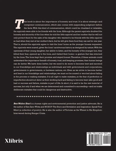 This book is about the importance of honesty and trust. It is about strategic and competent communication, which also comes with suspending judgment before the facts. With this kind of communication, which could be ritualized or relatable, the squirrels were able to be friends with the lions. Although the parent squirrels doubted the honesty and sincerity of the lion when he told the little squirrel and her mother that he will not only protect them for the sake of his daughter who wanted to be friends with the little squirrel so bad when they met at her mother's farm, but he will give them food they can eat for one year. That is, should the squirrels agree to visit the lions' home as the younger lioness requested. The squirrels were scared, given the lions' carnivorous history as designed by nature. With the openness of their young daughter, her ability to listen, and the honesty of the younger lion, they killed their fear, opened up to the lions, and visited their home-a gesture that was returned by the lions. The lions kept their promise and stayed honest. Therefore, if these animals could understand the importance/benefit of honesty, trust, and keeping promises, then human beings can do better. We have done better, but we need to do more to become best and succeed in our friendships and relationships as individuals and with governments and corporations, governments to governments, or between nations, etc. Even as we strive to become better and best in our friendships and relationships, we must not be scared or worried about failing in the process or making mistakes. It is all right to make mistakes, so the fear of perfection or imperfection should not deter us from working hard and failing to become best. Like good and bad or success and failure, mistake is part of life. In short, it is said to be the raw material of success, but only if and when we are determined and committed to succeeding-and not make deliberate mistakes that could be dangerous and destructive.