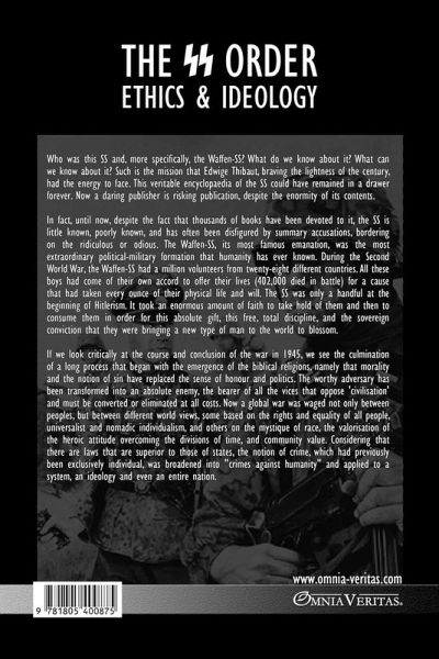 Who was this SS and, more specifically, the Waffen-SS? What do we know about it? What can we know about it? Such is the mission that Edwige Thibaut, braving the lightness of the century, had the energy to face. This veritable encyclopaedia of the SS could have remained in a drawer forever. In fact, until now, despite having been the subject of thousands of books, the SS is little known, poorly understood, and has often been disfigured by summary accusations, close to the ridiculous or odious. The Waffen-SS, its most famous emanation, was the most extraordinary political-military formation that humanity has ever known. During the Second World War, the Waffen-SS had a million volunteers from twenty-eight different countries. All these boys had come of their own accord to offer their lives (402,000 died in battle) for a cause that had taken every ounce of their physical life and will. The SS was only a handful at the beginning of Hitlerism. When one looks critically at the course and conclusion of the war in 1945, one sees the culmination of a long process that began with the emergence of the biblical religions, namely that morality and the notion of sin replaced the sense of honour and politics. The worthy adversary has been transformed into an absolute enemy, the bearer of all the vices that oppose 'civilisation' and must be converted or eliminated at all costs. Now a global war was waged not only between peoples, but between different world views, some based on the rights and equality of all people, universalist and nomadic individualism, and others on the mystique of race, the valorisation of the heroic attitude overcoming the divisions of time, and community value. Considering that there are laws that are superior to those of states, the notion of crime, which had previously been exclusively individual, was broadened into "crimes against humanity" and applied to a system, an ideology and even an entire nation.
