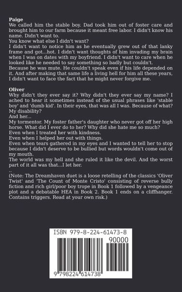 Paige We called him the stable boy. Dad took him out of foster care and brought him to our farm because it meant free labor. I didn't know his name. Didn't want to. You know what else I didn't want? I didn't want to notice him as he eventually grew out of that lanky frame and got...hot. I didn't want thoughts of him invading my brain when I was on dates with my boyfriend. I didn't want to care when he looked like he needed to say something so badly but couldn't. Because he was mute. He couldn't speak even if his life depended on it. And after making that same life a living hell for him all these years, I didn't want to face the fact that he might never forgive me. Oliver Why didn't they ever say it? Why didn't they ever say my name? I ached to hear it sometimes instead of the usual phrases like 'stable boy' and 'dumb kid'. In their eyes, that was all I was. Because of what? My disability? And her... My tormentor. My foster father's daughter who never got off her high horse. What did I ever do to her? Why did she hate me so much? Even when I treated her with kindness. Even when I helped her out with things. Even when tears gathered in my eyes and I wanted to tell her to stop because I didn't deserve to be bullied but words wouldn't come out of my mouth. The world was my hell and she ruled it like the devil. And the worst part of it all was that...I let her. .. (Note: The Dreamhaven duet is a loose retelling of the classics 'Oliver Twist' and 'The Count of Monte Cristo' consisting of reverse bully fiction and rich girl/poor boy trope in Book 1 followed by a vengeance plot and a debatable HEA in Book 2. Book 1 ends on a cliffhanger. Contains triggers. Read at your own risk.