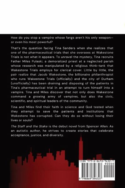How do you stop a vampire whose fangs aren't his only weapon--or even his most powerful? That's the question facing Tina Sanders when she realizes that one of the pharmaceutical trials that she oversees at Wakestone Trials is not what it appears. To unravel the mystery, Tina recruits Father Miles Pulaski, a demoralized priest at a neglected parish whose research was manipulated by a religious think-tank that Wakestone Trials employs for clerical cover. Little by little, the pair realize that Jacob Wakestone, the billionaire philanthropist who runs Wakestone Trials (officially) and the city of Durham (unofficially) has been draining and disposing of the patients in Tina's pharmaceutical trial in an attempt to turn himself into a vampire. Tina and Miles discover that not only does Wakestone command a growing army of vampires, but also the civic, scientific, and spiritual leaders of the community. Tina and Miles find their faith in science and God tested when they attempt to save the patients and institutions that Wakestone has corrupted. Can they do so without losing their lives or souls? The Staff and the Stake is the debut novel from Spencer Allen. As an autistic author, he strives to create stories that celebrate acceptance, justice, and diversity.