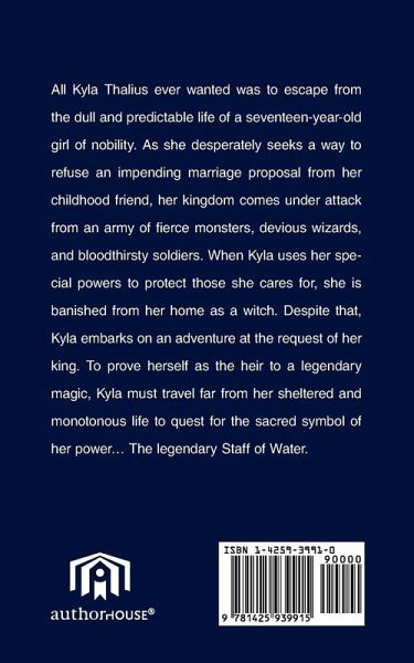 All Kyla Thalius ever wanted was to escape from the dull and predictable life of a seventeen-year-old girl of nobility. As she desperately seeks a way to refuse an impending marriage proposal from her childhood friend, her kingdom comes under attack from an army of fierce monsters, devious wizards, and bloodthirsty soldiers. When Kyla uses her special powers to protect those she cares for, she is banished from her home as a witch. Despite that, Kyla embarks on an adventure at the request of her king. To prove herself as the heir to a legendary magic, Kyla must travel far from her sheltered and monotonous life to quest for the sacred symbol of her power. The legendary Staff of Water.