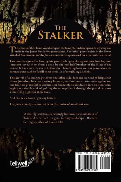 The secrets of the Home Wood, deep on the family farm, have spawned mystery and strife in the James family for generations. A mystical portal exists in the Home Wood. A few members of the James family have experienced the other side first-hand. Two months ago, after finding his parents deep in the mysterious land beyond, Jonathon saved them from a coup by the evil half brother of the King of the Grue. He had every reason to believe the Three Kingdoms were at peace when his parents went back to fulfill their promise of rebuilding a school. The arrival of a strange girl from the other side, lost and in need of help, soon shows Jonathon how very wrong he was. Jonathon must cross over again, and this time his grandfather and his best friend Marly are drawn in with him. What begins as a simple task of guiding the stranger back through the portal becomes a terrifying flight for their lives. And the news doesn't get any better. The James family is about to be in the centre of an all-out war. "A sharply-written, surprisingly humorous examination of 'loss' and 'other' set in a grim fantasy landscape". Richard Scrimger, author of Irresistible.