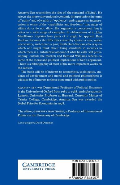 Amartya Sen reconsiders the idea of 'the standard of living'. He rejects the more conventional economic interpretations in terms of 'unity' and of wealth or 'opulence', and suggests an interpretation in terms of the 'capabilities and freedoms' that states of affairs do or do not allow. His argument is conceptual, but it refers to a wide range of examples. In elaborations of it, John Muellbauer explains how parts of it might be applied; Ravi Kanbur discusses the difficulties raised by choice ex ante, under uncertainty, and choice ex post; Keith Hart discusses the ways in which one might think about living standards in societies in which there is a substantial amount of what he calls 'self provisioning' outside the market; and Bernard Williams reflects on some of the moral and political implications of Sen's argument. There is a bibliography of most of the more important works on the subject. The book will be of interest to economists, sociologists, students of development and moral and political philosophers; it will also be of interest to those concerned with public policy.