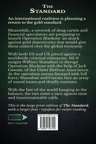 An international coalition is planning a return to the gold standard. Meanwhile, a network of drug cartels and financial speculators are preparing to launch Operation Blackout: an attack against gold depositories that would give them control over the global economy. With both US and UK pitted against a worldwide criminal enterprise, MI-6 assigns William Shanahan to disrupt Operation Blackout with the help of Jack Gawain, of the Ulster Defense Association. As the operation moves forward with full force, Shanahan and Gawain face an array of moral issues and deadly enemies. With the fate of the world hanging in the balance, the two enter a race against time and insurmountable odds. This is the large print edition of The Standard, with a larger font / typeface for easier reading.