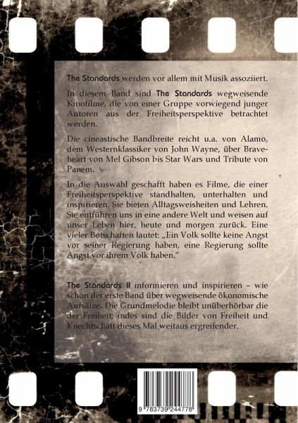 The Standards werden vor allem mit Musik assoziiert.In diesem Band sind The Standards wegweisende Kinofilme, die von einer Gruppe vielfach junger Autoren aus der Freiheitsperspektive betrachtet werden. Die cineastische Bandbreite reicht u.a. von Alamo, dem Westernklassiker von John Wayne, über Braveheart von Mel Gibson bis Star Wars und Tribute von Panem. In die Auswahl geschafft haben es Filme, die einer Freiheitsperspektive standhalten, unterhalten und inspirieren. Sie bieten Alltagsweisheiten und Lehren. Sie entführen uns in eine andere Welt und weisen auf unser Leben hier, heute und morgen zurück. Eine vieler Botschaften lautet: "Ein Volk sollte keine Angst vor seiner Regierung haben, eine Regierung sollte Angst vor ihrem Volk haben." The Standards II informieren und inspirieren - wie schon der erste Band über wegweisende ökonomische Aufsätze. Die Grundmelodie bleibt unüberhörbar die der Freiheit; indes sind die Bilder von Freiheit und Knechtschaft dieses Mal weitaus ergreifender.