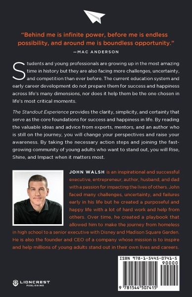 "Behind me is infinite power, before me is endless possibility, and around me is boundless opportunity." - Mac Anderson Students and young professionals are growing up in the most amazing time in history but they are also facing more challenges, uncertainty, and competition than ever before. The current education system and early career development do not prepare them for success and happiness across life's many dimensions, nor does it help them be the one chosen in life's most critical moments. The Standout Experience provides the clarity, simplicity, and certainty that serve as the core foundations for success and happiness in life. By reading the valuable ideas and advice from experts, mentors, and an author who is still on the journey, you will change your perspectives and raise your awareness. By taking the necessary action steps and joining the fast-growing community of young adults who want to stand out, you will Rise, Shine, and Impact when it matters most.