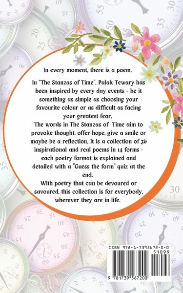 In every moment, there is a poem. In "The Stanzas of Time", Palak Tewary has been inspired by every day events - be it something as simple as choosing your favourite colour or as difficult as facing your greatest fear. The words in The Stanzas of Time aim to provoke thought, offer hope, give a smile or maybe be a reflection. It is a collection of 36 inspirational and real poems in 14 forms - each poetry format is explained and detailed with a "Guess the form" quiz at the end. With poetry that can be devoured or savoured, this collection is for everybody, wherever they are in life.