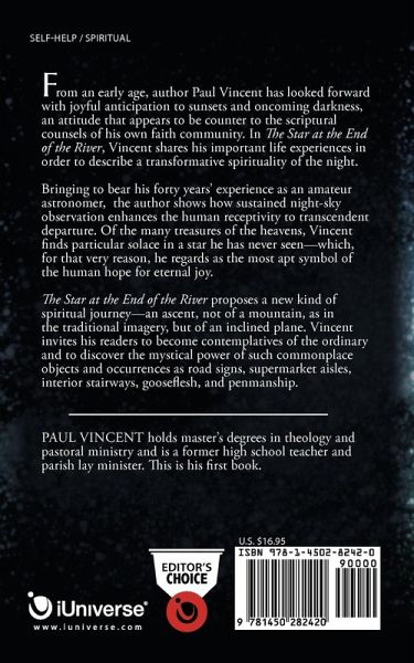 From an early age, author Paul Vincent has been drawn to the night. With hope and joy, he has looked forward to sunsets and oncoming nights, a attitude counter to a thousand common religious metaphors. In The Star at the End of the River, Vincent shares his important life experiences in order to illustrate how to transform conventional religious ideas about darkness. Bringing to bear his forty years' experience as an amateur astronomer, Vincent shows how sustained night-sky observation enhances the human receptivity to transcendent departure. He examines one of the many treasures of the heavens, a star-which, under the paradoxes of the mystical journey, is the most apt symbol of the human hope for eternal happiness. The Star at the End of the River proposes a new kind of mysticism-an ascent, not of a mountain, as in the traditional metaphor, but of an inclined plane. Vincent sketches a spiritual journey of marked gradualism and invites contemplation of the mystical power of such pedestrian experiences and objects as supermarket aisles, interior stairways, gooseflesh, and penmanship.