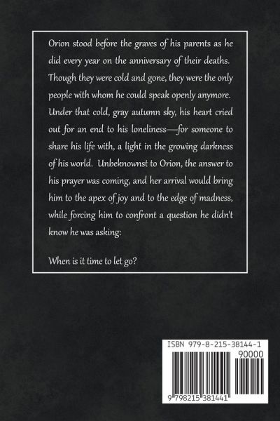 Orion stood before the graves of his parents as he did every year on the anniversary of their deaths. Though they were cold and gone, they were the only people with whom he could speak openly anymore. Under that cold, gray autumn sky, his heart cried out for an end to his loneliness-for someone to share his life with, a light in the growing darkness of his world. Unbeknownst to Orion, the answer to his prayer was coming, and her arrival would bring him to the edge of madness and the apex of joy, while forcing him to confront a question with which he had been struggling: When is it time to let go? Nota bene: This book is ham-fisted conservative erotica. Yes, that is what this is. So, don't get mad at me when you're 20 pages in and you start wondering WTF did you just buy. I done warned ya.