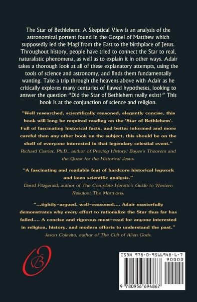 The Star of Bethlehem: A Skeptical View is an analysis of the astronomical portent found in the Gospel of Matthew which supposedly led the Magi from the East to the birthplace of Jesus. Throughout history, people have tried to connect the Star to real, naturalistic phenomena, as well as to explain it in other ways. Adair takes a thorough look at all of these explanatory attempts, using the tools of science and astronomy, and finds them fundamentally wanting. Take a trip through the heavens above with Adair as he critically explores many centuries of flawed hypotheses, looking to answer the question "Did the Star of Bethlehem really exist?" This book is at the conjunction of science and religion. "Well researched, scientifically reasoned, elegantly concise, this book will long be required reading on the 'Star of Bethlehem'. Full of fascinating historical facts, and better informed and more careful than any other book on the subject, this should be on the shelf of everyone interested in that legendary celestial event." Richard Carrier, Ph.D., author of Proving History: Bayes's Theorem and the Quest for the Historical Jesus. "A fascinating and readable feat of hardcore historical legwork and keen scientific analysis." David Fitzgerald, author of The Complete Heretic's Guide to Western Religion: The Mormons. "...tightly-argued, well-reasoned.... Adair masterfully demonstrates why every effort to rationalize the Star thus far has failed.... A concise and rigorous must-read for anyone interested in religion, history, and modern efforts to understand the past." Jason Colavito, author of The Cult of Alien Gods.