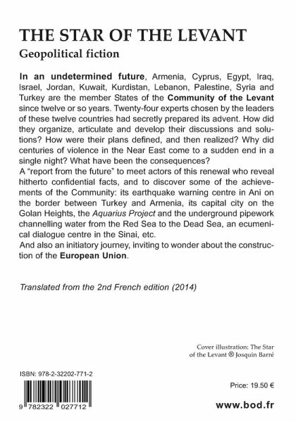 In an undetermined future, Armenia, Cyprus, Egypt, Iraq, Israel, Jordan, Kuwait, Kurdistan, Lebanon, Palestine, Syria and Turkey are the member States of the Community of the Levant since twelve or so years. Twenty-four experts chosen by the leaders of these twelve countries had secretly prepared its advent. How did they organize, articulate and develop their discussions and solutions? How were their plans defined, and then realized? Why did centuries of violence in the Near East come to a sudden end in a single night? What have been the consequences?A "report from the future" to meet actors of this renewal who reveal hitherto confidential facts, and to discover some of the achievements of the Community: its earthquake warning centre in Ani on the border between Turkey and Armenia, its capital city on the Golan Heights, the Aquarius Project and the underground pipework channelling water from the Red Sea to the Dead Sea, an ecumenical dialogue centre in the Sinai, etc.And also an initiatory journey, inviting to wonder about the construction of the European Union.Translated from the 2nd French edition (2014)