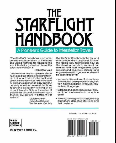 The Starflight Handbook A Pioneer's Guide to Interstellar Travel "The Starflight Handbook is an indispensable compendium of the many and varied methods for traversing the vast interstellar gulf--don't leave the Solar System without it!" --Robert Forward "Very sensible, very complete and useful. Its good use of references and technical 'sidebars' adds to the book and allows the nontechnical text to be used by ordinary readers in an easy fashion. I certainly would recommend this book to anyone doing any thinking at all about interstellar flight or the notion of possibilities of contacts between hypothetical civilizations in different stat systems." --Louis Friedman Executive Director, The Planetary Society The Starflight Handbook is the first and only compendium on planet Earth of the radical new technologies now on the drawing boards of some of our smartest and most imaginative space scientists and engineers. Scientists and engineers as well as general readers will be captivated by its: * In-depth discussions of everything from nuclear pulse propulsion engines to in-flight navigation, in flowing, non-technical language * Sidebars and appendices cover technical and mathematical concepts in detail * Seventy-five elegant and enlightening illustrations depicting starships and their hardware