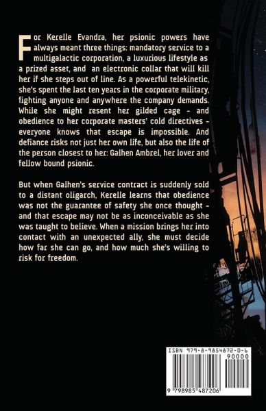 For Kerelle Evandra, her psionic powers have always meant three things: mandatory service to a multigalactic corporation, a luxurious lifestyle as a prized asset, and an electronic collar that will kill her if she steps out of line. As a powerful telekinetic, she's spent the last ten years of her life in the corporate military, fighting anyone and anywhere the company demands. While she might resent her gilded cage - and obedience to her corporate masters' cold directives - everyone knows that escape is impossible. And defiance risks not just her own life, but also the life of the person closest to her: Galhen Ambrel, her lover and fellow bound psionic. But when Galhen's service contract is suddenly sold to a distant oligarch, Kerelle learns that obedience was not the guarantee of safety she once thought - and that escape may not be as inconceivable as she was taught to believe. When a mission brings her into contact with an unexpected ally, she must decide how far she can go, and how much she's willing to risk for freedom.