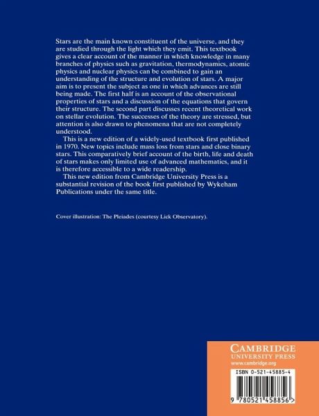 This textbook gives a clear account of the manner in which knowledge in many branches of physics, such as gravitation, thermodynamics, atomic physics, and nuclear physics, can be combined to gain an understanding of the structure and evolution of stars. A major aim is to present the subject as one in which advances are still being made. The first half is an account of the observational properties of stars and a discussion of the equations that govern their structure. The second part discusses recent theoretical work on stellar evolution. The successes of the theory are stressed, but attention is also drawn to phenomena that are not completely understood. This is a new edition of a widely-used textbook first published in 1970. New topics include mass loss from stars and close binary stars.