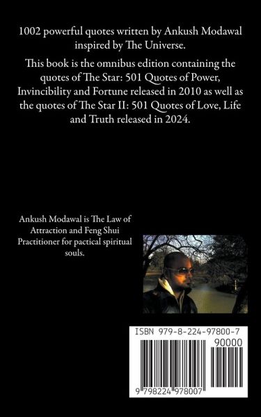 1002 powerful quotes written by Ankush Modawal inspired by The Universe. This book is the omnibus edition containing the quotes of The Star: 501 Quotes of Power, Invincibility and Fortune released in 2010 as well as the quotes of The Star II: 501 quotes of Love, Life and Truth released in 2024.