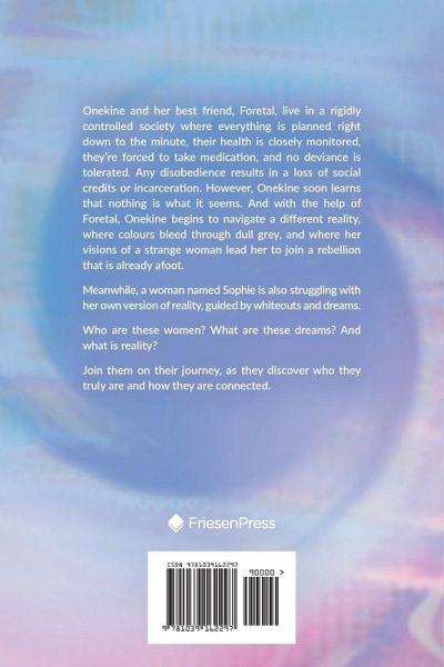 Onekine and her best friend, Foretal, live in a rigidly controlled society where everything is planned right down to the minute, their health is closely monitored, they're forced to take medication, and no deviance is tolerated. Any disobedience results in a loss of social credits or incarceration. However, Onekine soon learns that nothing is what it seems. And with the help of Foretal, Onekine begins to navigate a different reality, where colours bleed through dull grey, and where her visions of a strange woman lead her to join a rebellion that is already afoot. Meanwhile, a woman named Sophie is also struggling with her own version of reality, guided by whiteouts and dreams. Who are these women? What are these dreams? And what is reality? Join them on their journey, as they discover who they truly are and how they are connected.