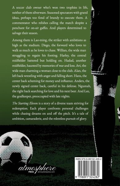 A soccer club owner who's won two trophies in life, neither of them silverware. Seasoned spectators with grand ideas, perhaps too fond of brandy to execute them. A commentator who relishes calling the match despite a penchant for on-air gaffes. And players determined to salvage their season. Among them is Lao-ming, the striker with ambitions as high as the stadium. Diego, the forward who loves to walk as much as he loves to chase. Willian, the wide man struggling to regain his footing. Harley, the central midfielder battered but holding on. Hadad, another midfielder, haunted by memories of war and loss. Avi, the wide man charming a woman close to the club. Alan, the left back wrestling with anger and falling short. Hans, the center back scheming for money and influence. Anders, the newly signed center back, careful in his defense. Ngumah, the right back searching for love and his next beer. And Lee, the goalkeeper, preoccupied with late nights. The Starting Eleven is a story of a diverse team striving for redemption. Each player confronts personal challenges while chasing dreams on and off the pitch. It's a tale of ambition, camaraderie, and the relentless pursuit of glory.