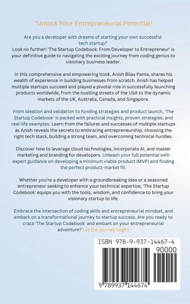 Unlock Your Inner Entrepreneur: Become a Tech Startup Visionary! Are you a developer with big dreams of launching your own successful tech startup? Welcome to "The Startup Codebook: From Developer to Entrepreneur" - your ultimate guide to turning your coding brilliance into a thriving business venture. In this compelling and transformative book, Anish Bilas Panta, a seasoned entrepreneur and tech wizard, shares his wealth of experience in building businesses from the ground up. With expertise in fintech and insurtech, Anish has helped multiple startups succeed and played a pivotal role in successfully launching products across the globe, from the bustling streets of the USA to the dynamic markets of the UK, Australia, Canada, and Singapore. In "The Startup Codebook," Anish takes you on an inspiring journey through the entire startup process - from ideation and validation to funding strategies and product launch. Drawing on real-life examples of both failure and triumph, he imparts invaluable insights and proven strategies that will empower you to embrace entrepreneurship with confidence. Discover how to choose the right tech stack, build a rock-solid team, and conquer technical challenges. Leverage cloud technologies and harness the power of artificial intelligence to stay ahead in today's fast-paced business landscape. Learn the art of developing a minimum viable product (MVP) and finding your perfect product-market fit. Explore innovative marketing and branding strategies tailor-made for developers and unleash your startup's true potential. Whether you're a developer with a groundbreaking idea or an established entrepreneur seeking to amplify your technical expertise, "The Startup Codebook" equips you with the tools and wisdom to transform your vision into a reality. Don't let your coding brilliance go to waste - crack "The Startup Codebook" and embrace the thrilling world of entrepreneurship. Your startup journey begins here. Let the adventure unfold!