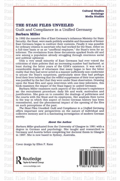 In 1992 the massive files of East Germany's infamous Ministry for State Security, the Stasi, were made publicly available and thousands of former East Germans began to confront their contents. Finally it was possible for ordinary citizens to ascertain who had worked for the Stasi, either on a full-time basis or as an "unofficial employee," the Stasi's term for an informer. The revelations from these documents sparked feuds old and new among a population already struggling through enormous social and political upheaval. Drawing upon the Stasi files and upon interviews with one-time informers, this book examines the impact of the Stasi legacy in united Germany. Barbara Miller examines such aspects of the informer's experience as: the recruitment procedure; daily life and work; motivation and justification. She goes on to consider the dealings of politicians and the courts with the Stasi and its employees. Her analysis then turns to the way in which this aspect of recent German history has been remembered, and the phenomenal impact of the opening of the files on such perceptions of the past. The Stasi Files Unveiled: Guilt and Compliance in a Unified Germany offers important new perspectives on the nature of individual and collective memory and is a fascinating investigation of modern German society. Barbara Miller graduated from the University of Glasgow in 1991 with a degree in German and psychology. She taught and researched in Germany and Austria before completing her doctoral thesis in Glasgow in 1997. She is now based in Sydney, Australia.
