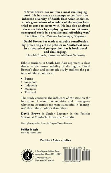 Ethnic tensions in Southeast Asia represent a clear threat to the future stability of the region. David Brown's clear and systematic study outlines the patterns of ethnic politics in: * Burma * Singapore * Indonesia * Malaysia * Thailand The study considers the influence of the State on the formation of ethnic groups and investigates why some countries are more successful in 'managing' their ethnic politics than others.
