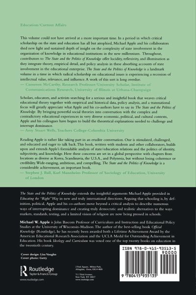 1. The State and the Politics of Knowledge Michael W. Apple 2. Becoming Right: Education and the Formation of Conservative Movements Michael W. Apple and Anita Oliver 3. Reading Polynesian Barbie: Iterations of Race Nation and State Hannah Tavares 4. Rethinking the Education/State Formation Connection: The State Cultural Struggles and Changing the School Ting-Hong Wong and Michael W. Apple 5. What Happened to Social Democratic Progressivism in Scandanavia?: Restructuring Education in Sweden and Norway in the 1990s Petter Aasen 6. Schooling Work and Subjectivity Misook Kim Cho and Michael W. Apple 7. Democracy Technology and Curriculum Lessons from the Critical Practices of Korean Teachers Youl-Kwan Sung and Michael W. Apple 8. Educating the State Democratizing Knowledge: The Citizen School Project in Porto Alegre Brazil Luis Armando Gandin and Michael W. Apple 9. Afterword Michael W. Apple