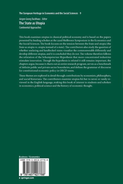 This book examines utopias in classical political economy and is based on the papers presented by leading scholars at the 22nd Heilbronn Symposium in the Economics and the Social Sciences. The book focuses on the tension between the State and utopia (the State as utopia vs. utopia instead of a state). The contributors also study the question of whether seafaring and landlocked states visualize the commonwealth differently and develop different utopias, and it is concluded they do not. The volume therefore follows the refutation of the Schumpeterian Hypothesis that more concentrated industries stimulate innovation. Though the hypothesis is refuted it still remains important, the chapters argue, because it charts out an entire research program, serves as a benchmark of definite public and private sector boundaries, and defines the grammar of discourse for constitutional economic policy in OECD states.