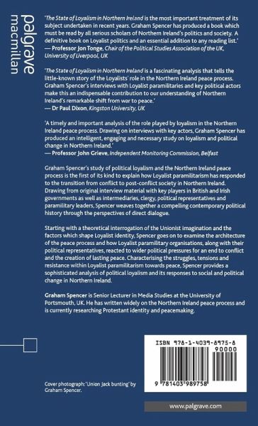 'The State of Loyalism in Northern Ireland is a fascinating analysis that tells the little known story of the loyalist role in the Northern Ireland peace process. Graham Spencer's interviews with loyalist paramilitaries and key political actors make this an indispensable contribution to our understanding of Northern Ireland's remarkable shift from war to peace.' - Dr Paul Dixon, Kingston University, UK