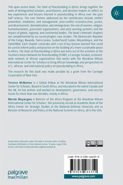 This open access book on the state of peacebuilding in Africa brings together the work of distinguished scholars, practitioners, and decision makers to reflect on key experiences and lessons learned in peacebuilding in Africa over the past half century. The core themes addressed by the contributors include conflict prevention, mediation, and management; post-conflict reconstruction, justice and Disarmament Demobilization and Reintegration; the role of women, religion, humanitarianism, grassroots organizations, and early warning systems; and the impact of global, regional, and continental bodies. The book's thematic chapters are complemented by six country/region case studies: The Democratic Republic of Congo, Rwanda, Sierra Leone, Sudan/South Sudan, Mozambique and the Sahel/Mali. Each chapter concludes with a set of key lessons learned that could be used to inform the building of a more sustainable peace in Africa. The State of Peacebuilding in Africa was born out of the activities of the Southern Voices Network for Peacebuilding (SVNP), a Carnegie-funded, continent-wide network of African organizations that works with the Wilson Center to bring African knowledge and perspectives to U.S., African, and international policy on peacebuilding in Africa. The research for this book was made possible by a grant from Carnegie Corporation of New York.