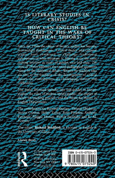 Since the early 1960s the academic certainties of 'traditional' literary studies have been challenged by techniques and perspectives borrowed from other disciplies. And this so-called 'crisis' in English studies is now being complicated by the recent changes in the institutional structure of education. This timely collection provides an overview of how critical theory operates in practice and an indispensable guide to The State of Theory today. Topic discussed include: gender, race, the gothic, the value of student 'theory guides', and the impact of theory on teaching practice and the future for theory in our English departments.